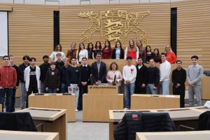 Schülerinnen und Schüler der Klassen 10a und 10b der Gemeinschaftsschule in der Taus besuchten den baden-württembergischen Landtag, um ihr Projekt „Demokratie und Friedensbildung“ vorzustellen. Empfa…